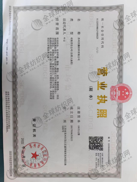 统一社会信用代码/营业执照注册号: | 91320509MA1P4B0H2N | 名称: | 苏州宗灏纺织有限公司 |